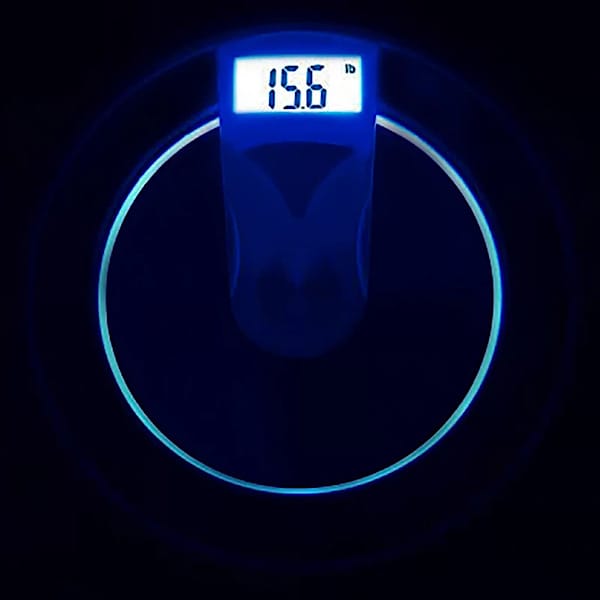 این ترازوی دایرهای شکل به قطر 33 و ضخامت 3.5 سانتیمتر، دارای وزنی حدود 2 کیلوگرم است. بر روی بدنه این ترازو LED آبیرنگ دایرهای شکل قرار دارد و ظاهری منحصربفرد به این دستگاه میبخشد.