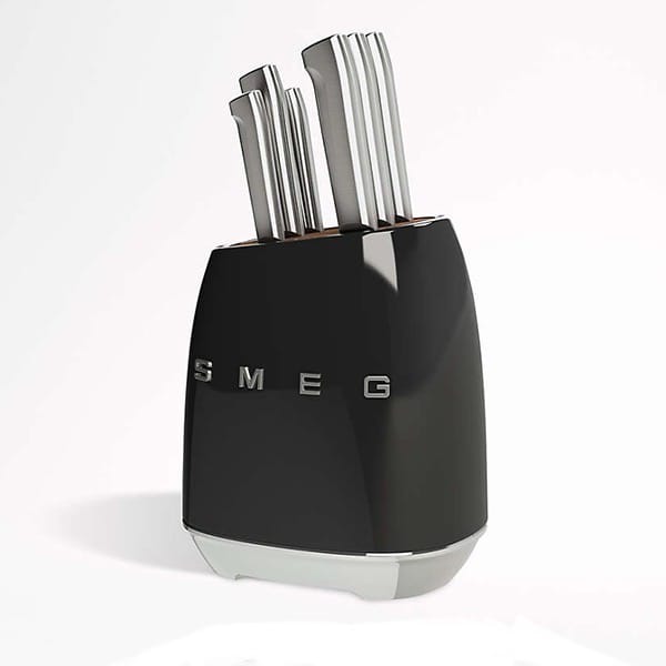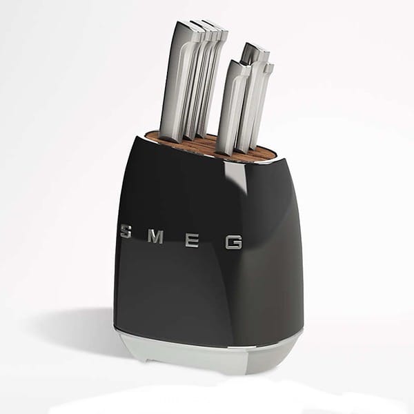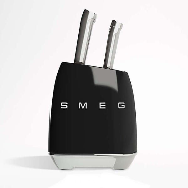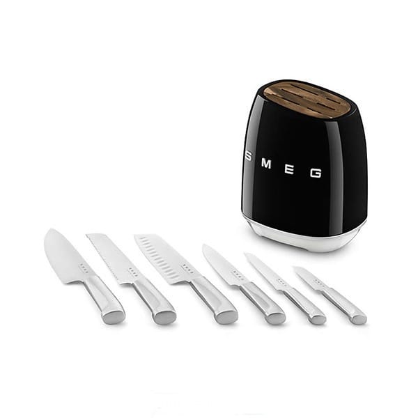 با سرویس چاقو اسمگ استایل کلاسیک SMEG و ظاهری قدیمی دهه 1950 را به میز آشپزخانه خود بیاورید! بلوک چاقوی چوب اقاقیا دارای بدنه بیرونی فولاد کربنی با پوشش پولیش است که به راحتی تمیز میشود و به رنگ کرم براق پوشیده شده است برای هماهنگی با سایر لوازم SMEG رنگ است. پایههای ضد لغزش مانع از لغزش بلوک در هنگام برداشتن چاقو میشوند. چاقوهای این مجموعه دارای تیغه های با کیفیت استیل ضد زنگ آلمانی و دسته های فولادی ضد زنگ صیقلی و بسیار بادوام هستند و برای کارهای روزمره برش انواع مواد غذایی آماده هستند. این مجموعه شامل چاقوی سبزیجات، چاقوی همه کاره، چاقوی گوشت، چاقوی سانتوکو، چاقوی نان و چاقوی آشپز می باشد.